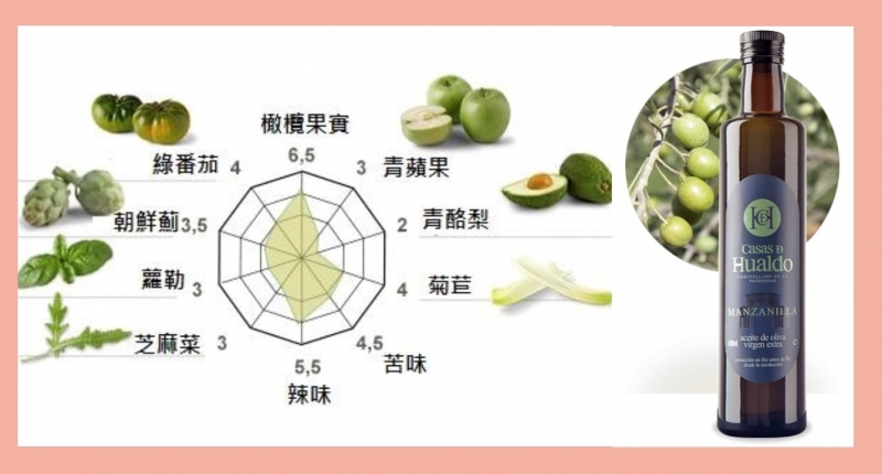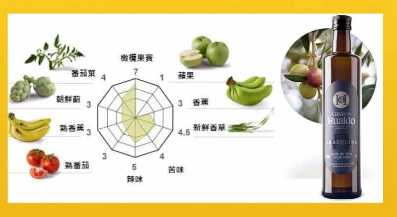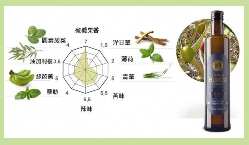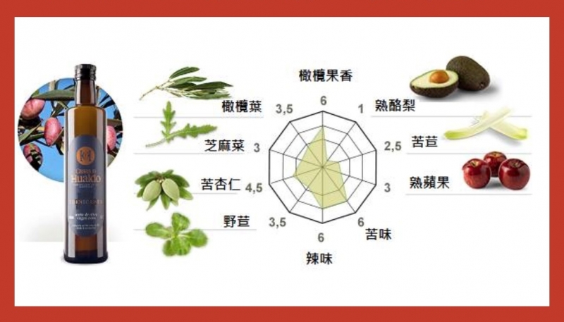 果香味、苦味、辣味,是國際橄欖油品評機構,理想初榨橄欖油應具有的風味,也是新鮮的頂級橄欖油中缺一不可的特徵。(果香味來自不同品種新鮮油款本身獨具的特色,而油中的苦辣味來自有益健康的「抗氧化」成分)