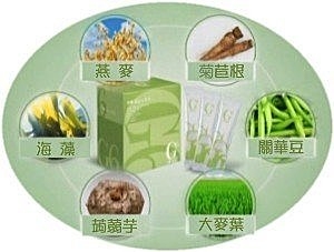 燕麥麩、菊苣根萃取物、關華豆膠、黑糖、大麥葉、燕麥纖維、蒟蒻萃取物、綠燕麥萃取物、海藻萃取物、酵母粉末